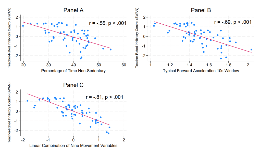 My colleagues and I recently showed that preschool children’s typical intensity of forward acceleration during the school day was strongly related to teacher reports of their attention and inhibitory control (Koepp & Gershoff, 2024, Child Development; Koepp et al., 2022, Developmental Science). We applied machine learning methods ideally suited to the high-volume data to identify temporal patterns of children’s behavior.